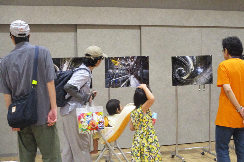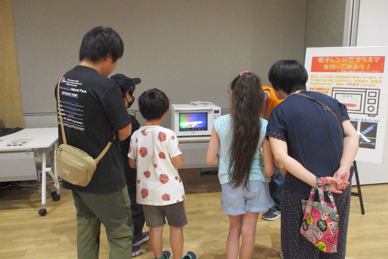 ワークショップでは「シャカシャカ発電機」を製作しました。およそ10分で完成する簡単な工作で、約180名の参加者が楽しみました。完成後は、紙コップの中の石をシャカシャカと振り、その振動によって圧電素子が発電し、LEDが点灯する様子を体験しました。科学実験コーナーでは、電子レンジで、蛍光灯やヘリウム、ネオン、キセノンなどのガスを封入したガラス管を加熱し、光るプラズマを発生させました。子供たちは、明るく輝くプラズマに驚いて、歓声を上げていました。研究紹介コーナーでは、大型ヘリカル装置(LHD)の1/25模型と写真パネル(フォトグラファーの林 佑樹氏撮影)を用いて、核融合研究の必要性、現状、将来展望について説明しました。近所の方の中には研究所のことをご存じない方も多くいましたが、「未来社会にとって大切な研究をしているのですね」とご理解いただけました。