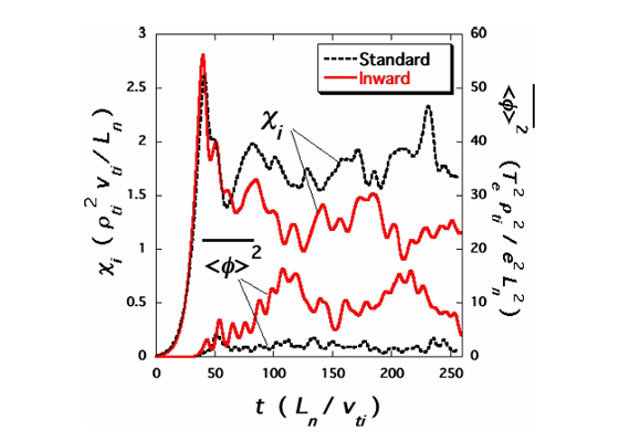 2000年代半ば以降は、渡邉智彦さん(現・名古屋大学)によるジャイロ運動論的シミュレーションコードGKVの開発に協力し、LHDにおけるイオン温度勾配(ITG)モード等の微視的不安定性、乱流輸送やゾーナルフローに関する多くの共著論文を出版することができました。特に、乱流輸送の抑制をもたらす物理機構として長年にわたり注目されているゾーナルフローの残留振幅や測地的音響モード(GAM)の減衰振動過程に対して、粒子軌道の有限幅、ヘリカル磁場成分や背景径方向電場の効果を取り入れた理論公式を2006年に発表しました。その妥当性は、GKVコードを始め、多くのジャイロ運動論的シミュレーションコードによって検証・確認されました。LHD の磁気軸内寄せ配位の実験では、標準配位に比べて不安定性をもたらす磁気丘が強くなるにもかかわらず、新古典輸送のみならず乱流輸送も低減することが、現在のNIFS所長の山田弘司先生らによって示されていました。我々の理論シミュレーション研究により、磁気軸内寄せ配位においてゾーナルフローの生成と乱流輸送の抑制が強まることが示され(図1参照)、2008年の関連論文は、プラズマ・核融合学会論文賞を受賞しました。これらの成果は、ゾーナルフロー生成によるプラズマ閉じ込め改善を目指した磁場配位最適化研究の先駆けとなりました。また、2009年に発表した衝突モデル演算子は、現在も国内外の主要なジャイロ運動論的シミュレーションコードにおいて使用されています。その後も、仲田資季さん(現・駒澤大学)や沼波政倫さん(現・メタ階層ダイナミクスユニット)をはじめとする多くの若手研究者と、ジャイロ運動論に基づく理論シミュレーション共同研究を実施しました。これらの研究を通じて、2017年から2022年に実施されたLHD重水素実験における同位体効果の予測と検証等を行うとともに、2017年に堀内利得先生から引き継ぎ2023年まで私が総主幹を務めた数値実験炉研究プロジェクトにおいて、多くの成果創出に貢献することができました。