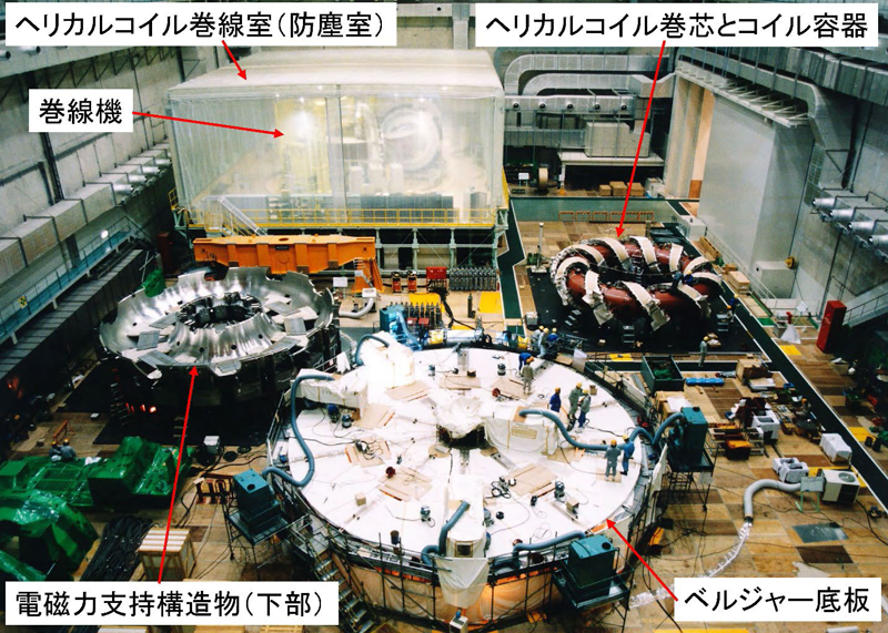 超伝導核融合実験装置の一覧を表1に示します。LHDの設計当時、直径1 mm程度の数百本の超伝導線が多重に撚られたケーブルを金属管に挿入するケーブル・イン・コンジット導体(CICC)の開発が進行中で、ポロイダルコイルは世界で最初にCICCを実用化したコイルです。一方、ヘリカルコイルは成形のやり易さを優先して浸漬冷却方式の複合導体が採用され、この種の核融合マグネットとしては最後のものとなっており、1990年頃の超伝導技術を象徴する装置といえます。LHDの設計作業においては、最初に全体組立方法の策定を担当しました。ヘリカルコイルはそれを囲む円環状の支持構造物から支えられる構造ですが、その組立方法を決めあぐねていたところ、ヘリカルコイル容器(シェルアーム)の50 cm×50 cmの空間に人が入って接続部を溶接する方法が企業側から提案され、実物大の試作を行って方法が確定しました。LHDの設計において最も重要な提案の一つであったと思います。主な担当機器はヘリカルコイルと電磁力支持構造物でした。全長36 kmのヘリカルコイル導体は1年半にわたる昼夜2交代で巻線されました。金属片の混入を防ぐため、図1に示すように本体室内に防塵室を組み立て、防塵服を着用しての作業でした。当時の防塵服は熱がこもるため体調管理が重要な留意点でした。開始時の巻線速度は目標の半分にも至らず、改善策をあれこれと議論しました。決定打はなかったように思いますが、中盤から加速し、目標工程を達成することができました。結局は、作業者の方々の習熟と熱意さらにチームワークが最大の要因であったと思います。私にできたことは、現場作業を滞らせないように研究所側の決断を早くすることと企業側の設計進捗を督促することくらいでしたので、作業者の方々には本当に感謝しています。巻線工程が遅延しなかったことが、LHDの計画通りの完成を導いたと思います。
