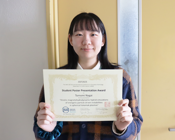 核融合科学研究所の連携大学院生である、東京大学大学院新領域創成科学研究科複雑理工学専攻修士2年の永井友望さんが、「Kinetic-magnetohydrodynamic hybrid simulations of energetic particle driven instabilities in spherical tokamak plasmas(球状トカマクにおける高エネルギー粒子励起不安定性の運動論的電磁流体力学ハイブリッドシミュレーション)」の成果に対して、44th JSST Annual International Conference on Simulation Technology (JSST2025) Student Poster Presentation Awardを受賞しました。(受賞日2025年11月26日)