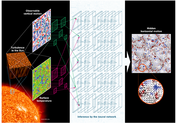 A research group led by the National Astronomical Observatory of Japan (NAOJ), the National Institute for Fusion Science (NIFS), and the Graduate University for Advanced Studies (SOKENDAI) has succeeded in constructing a new deep learning model that infers hidden turbulent motion from image data of the solar surface. Using a number of data from several numerical simulations that reproduce solar convection, a neural network was trained to learn the correlation between the horizontal motion of turbulence, which is diffcult to observe directly, and the vertical motion of turbulence and surface temperature, which are observable. As a result, a new analysis method to infer the horizontal motion of turbulence from the image data of vertical motion and surface temperature has been realized. Furthermore, a new method for analyzing the inference accuracy was developed, and it was found a rapid change of the inference accuracy for structures smaller than the typical size of generated convection cells. By clarifying effectiveness of the method in analyzing actual solar turbulence data and the current achievement of the inference accuracy, we have obtained a clue for further improvement of the method in the future. This research was promoted within the framework of the NINS cross-disciplinary study for Transport, and Heating Dynamics in Laboratory and Solar/Astrophysical Plasmas: SoLaBo-X. A new development is underway to apply the deep learning model developed in this research to the study of turbulence fluctuation in fusion plasmas.