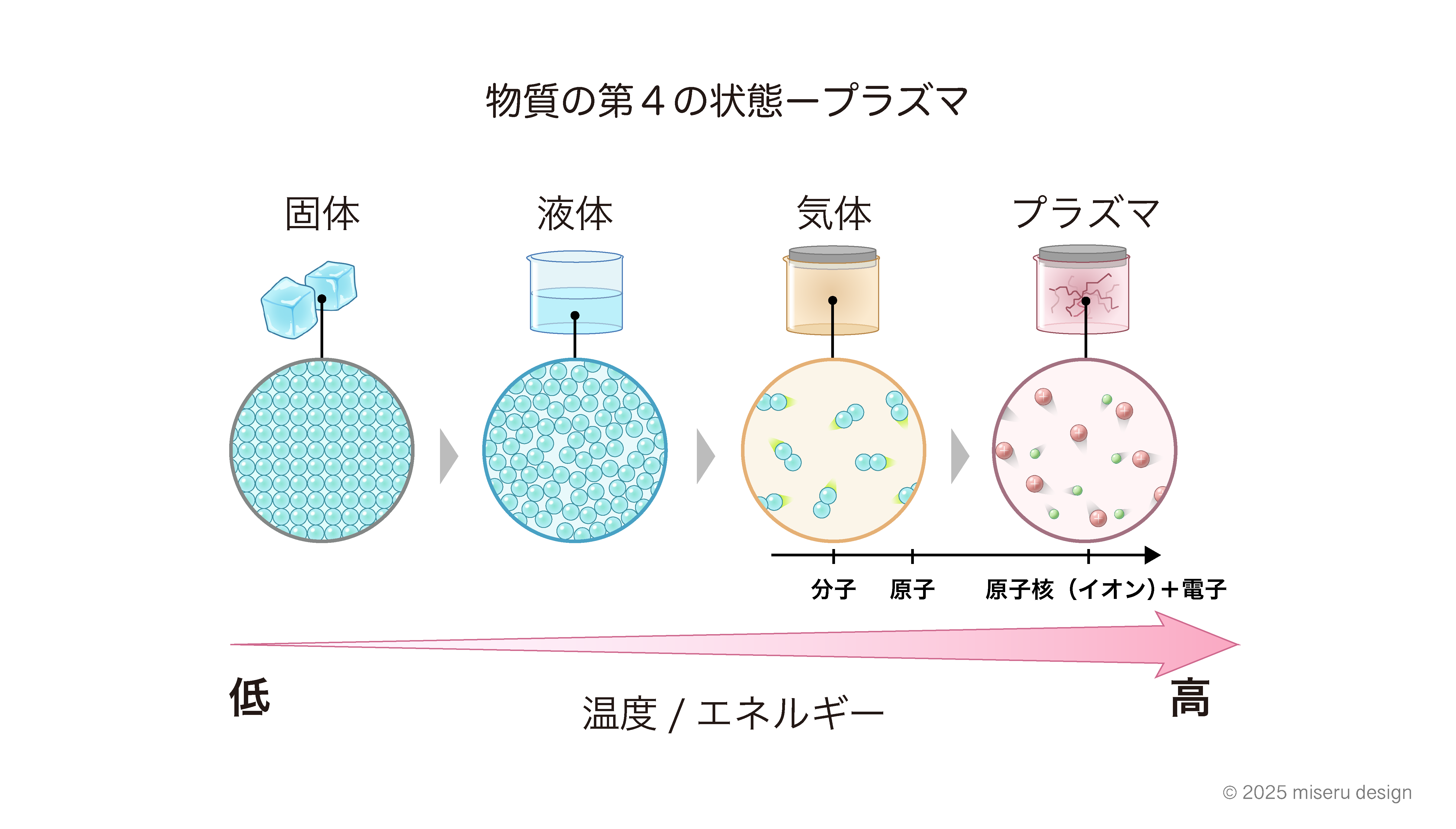 ところが、さらに温度を上げていき、1万度を超えるあたりから、電子が原子からはぎ取られる 「電離」 という現象が起こります。原子核(イオン)と電子が自由に動き回るこの特別な状態を 「プラズマ」 と呼び、「物質の第4の状態」 ともいわれます。