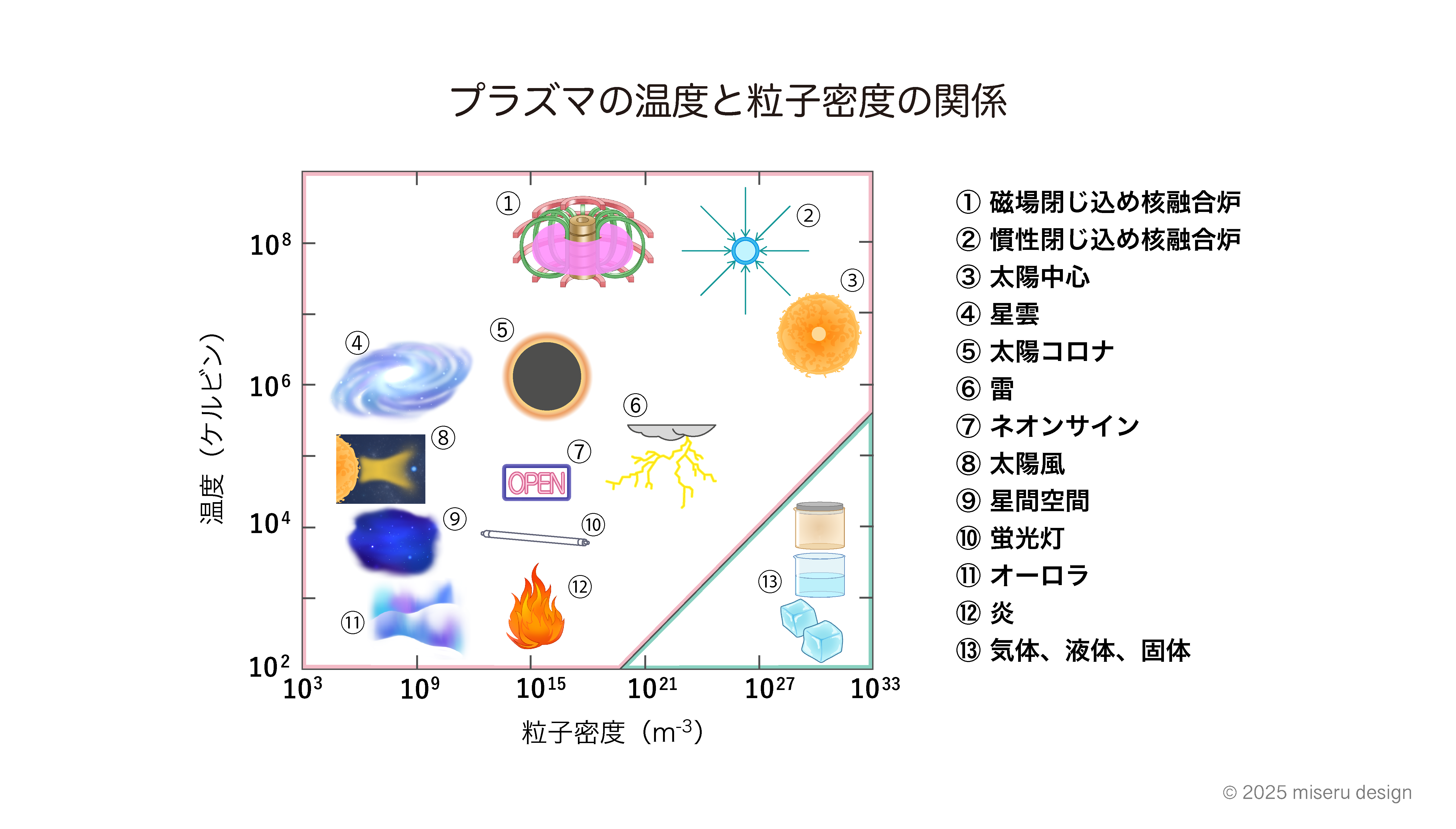 この図は、温度(単位:ケルビン。273 ケルビンが 0 ℃に相当)と粒子密度との関係を示しています。ピンクの枠で囲まれた領域がプラズマ状態、緑の枠で囲まれた領域が固体・液体・気体にあたります。