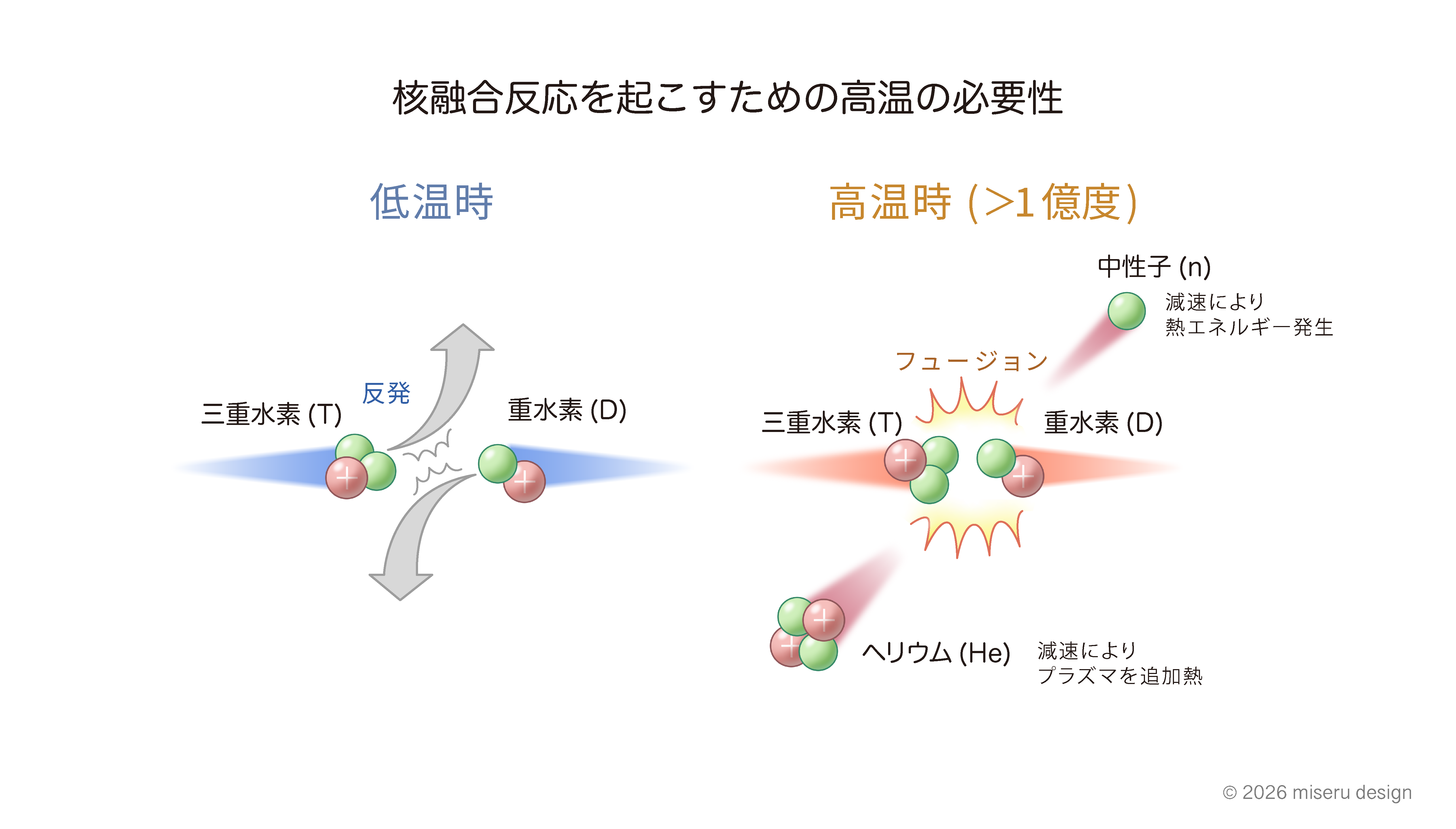 核融合発電では、重水素と三重水素の融合反応を利用しますが、これら2種類のガスを混合しただけでは反応は起こりません。約1億度という超高温にすることで、はじめて融合反応が起こります。