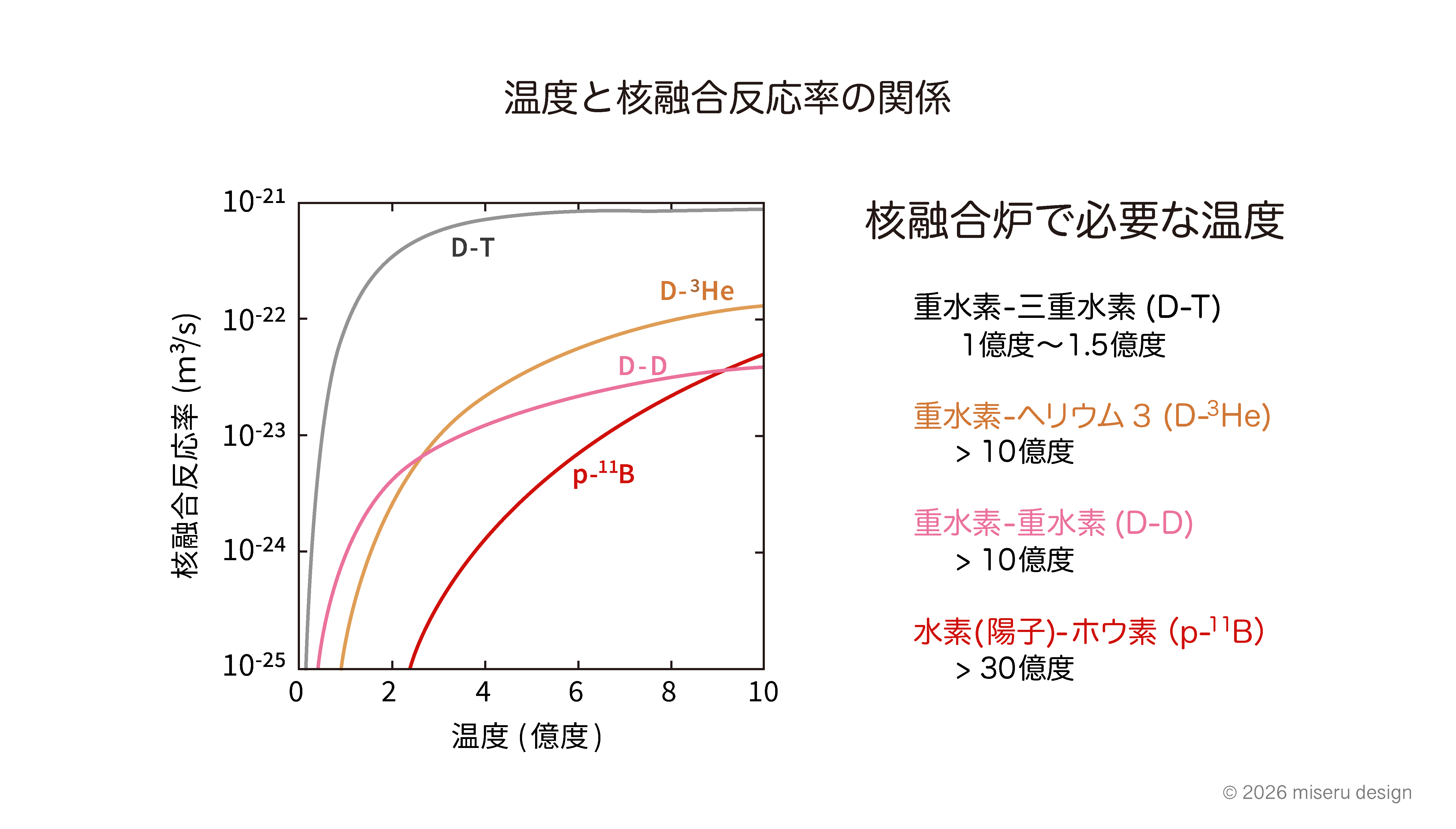一方、先進的な核融合反応である重水素とヘリウム3(D–3He)や重水素同士(D–D)の反応は、D–T反応に比べて反応率が一桁以上低いため、10億度以上のより高い温度が必要となります。