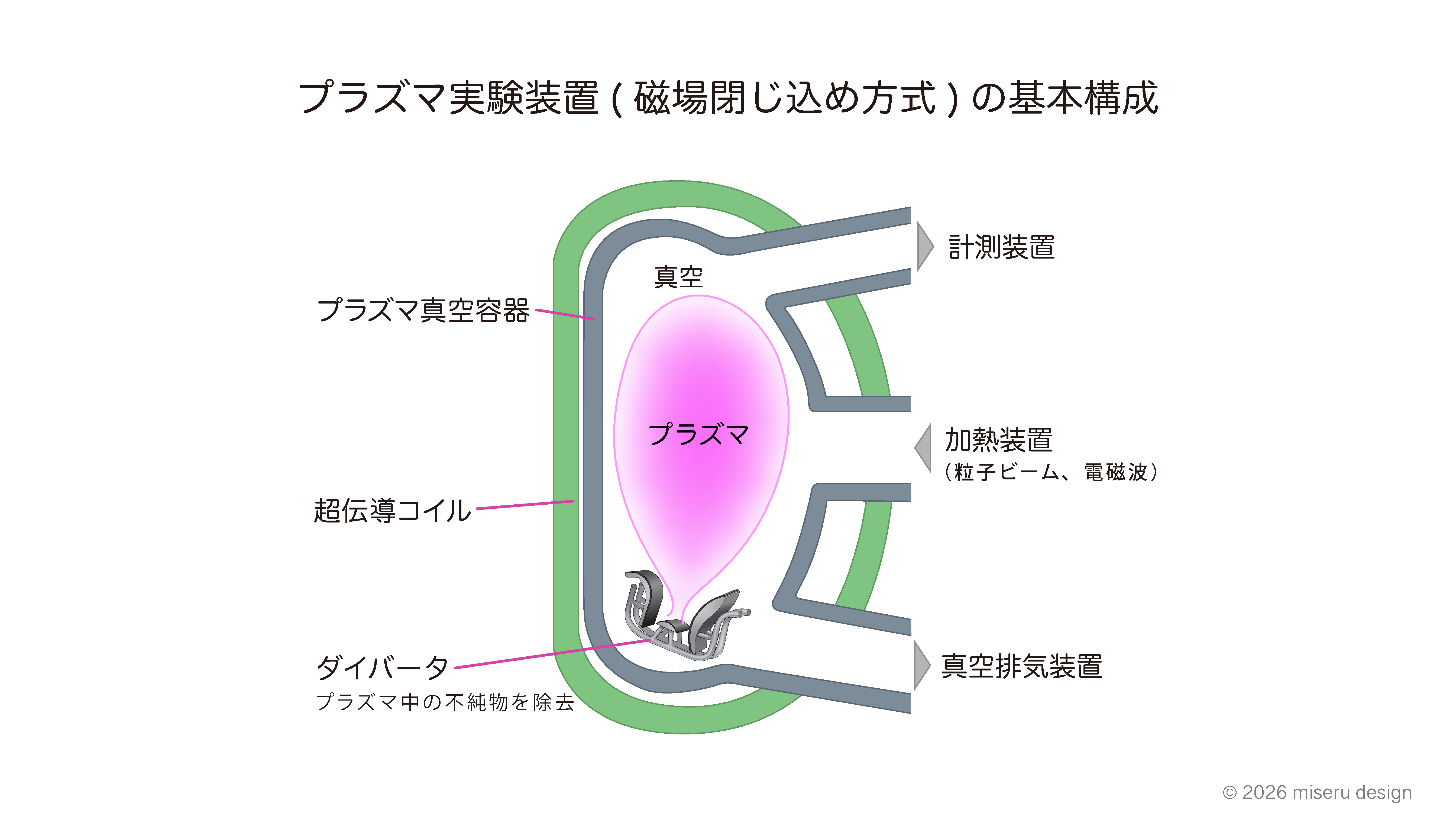 また、プラズマ中の不純物を除去するためのダイバータと呼ばれる装置が、真空容器の内部に設置されています。