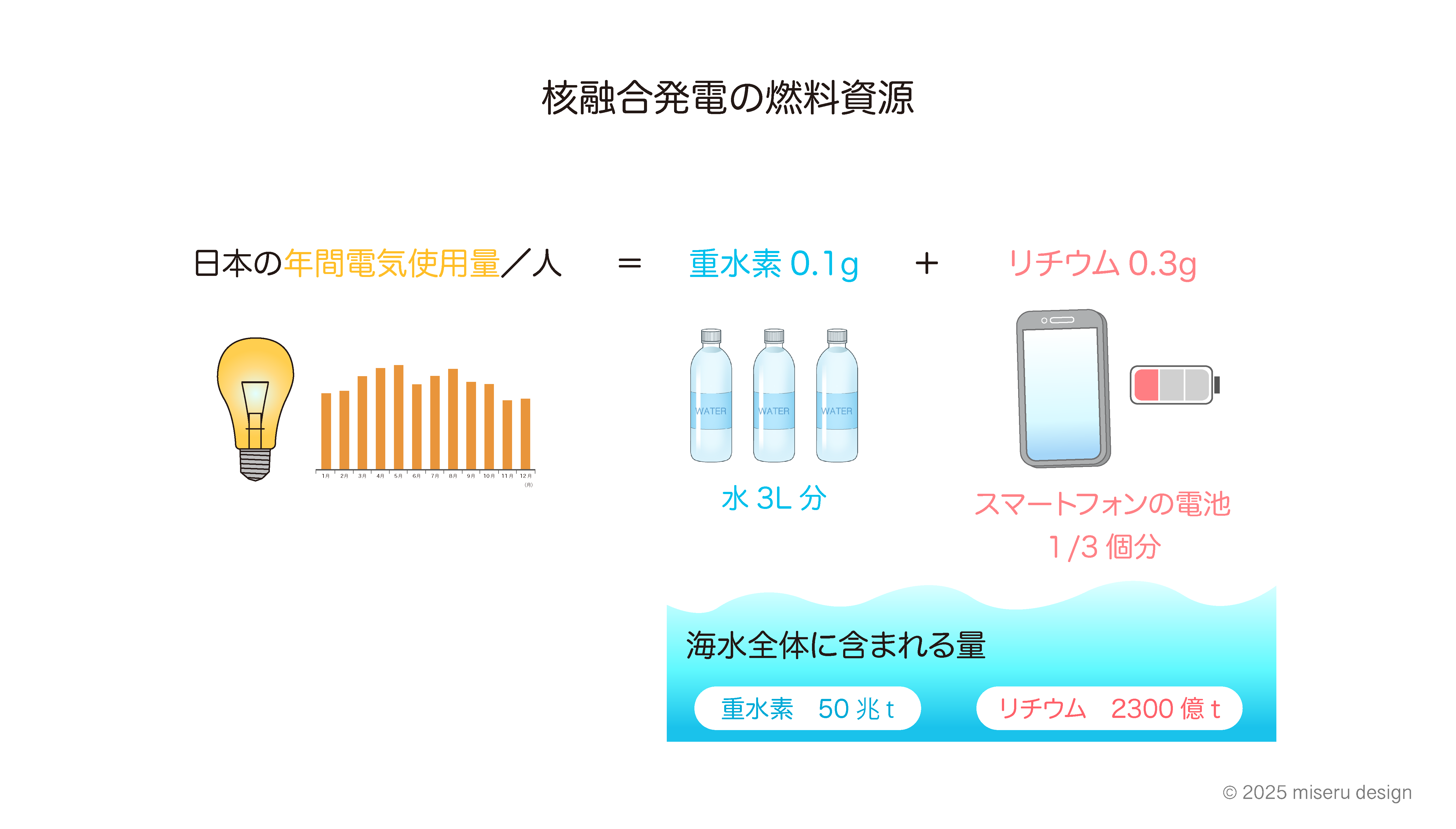 たとえば、水3リットルに含まれる重水素0.1 gと、スマートフォンの電池の約1/3に相当するリチウム0.3 gを燃料として用いると、日本人1人が1年間に消費する電力量をまかなうことができます。