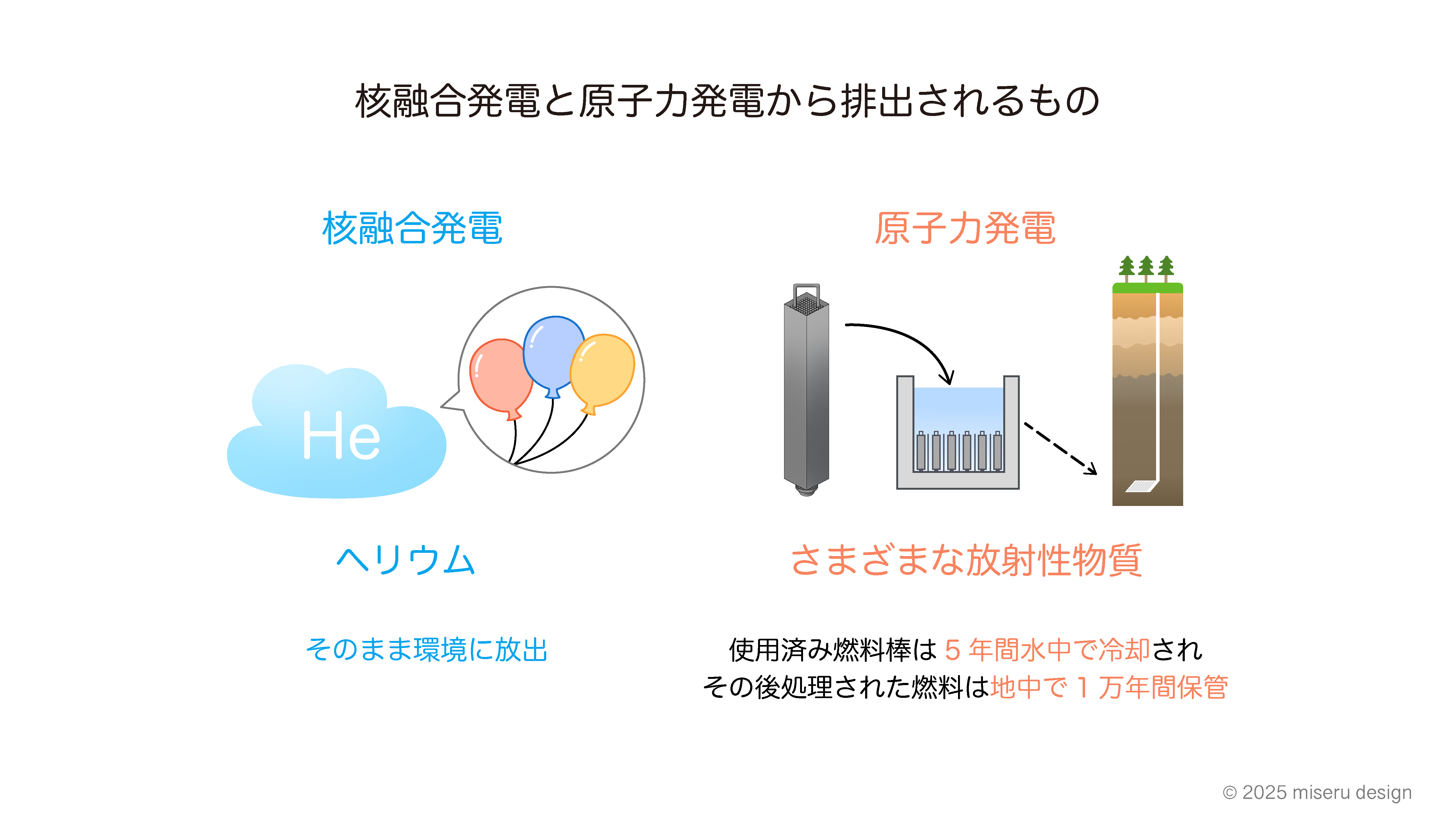核融合発電と原子力発電を比較すると、反応によって生じ、発電所から排出されるものに大きな違いがあります。 核融合発電では、反応の結果生じるのはヘリウムガスであり、そのまま環境中に放出しても影響はありません。