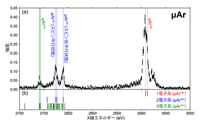 0.1気圧のアルゴン原子(Ar)を標的とした場合のX線スペクトルを図2に示します。2700-2850 eVの範囲に3本、2900-3050 eVの範囲に1本のピークが観測されました。それぞれのX線エネルギーを電子状態計算の結果と比較したところ、高エネルギー側のピークは束縛電子を1個有する多価ミュオンアルゴンイオン(µAr16+)、低エネルギー側の3本のピークは束縛電子を2個または3個有するµAr15+, µAr14+が放出した電子特性X線とエネルギーが一致することが判明しました。特に、2個の電子が束縛されたµAr15+によるX線は2つのピークに分かれており、それぞれスピンの向きが異なる電子状態に対応しています。このように、TES検出器の優れたエネルギー分解能を生かすことで、束縛電子のスピンの向きまで踏み込んだ、多価ミュオンイオンの詳細な観測に成功しました。