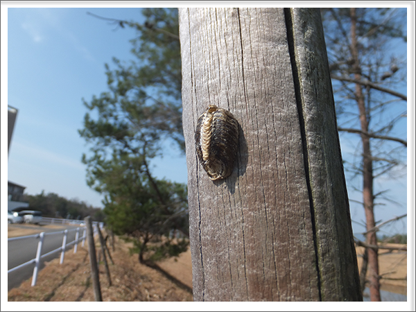 木の杭に奇妙なものがくっついていました。これはカマキリ(ハラビロカマキリ)の卵です。実際には卵の集まりで、中には数百個の卵が入っているそうです。秋に産卵し、春、つまりもう少ししたら孵化します。調べてみると、面白い言い伝えが見つかりました。カマキリが高い位置に卵を産み付けると、その年は積雪が多いという言い伝えです。今日見つけた卵は、地上から1メートルを超えていました。さて、今年は積雪が多かったですが、カマキリはちゃんと予測していたのでしょうか。