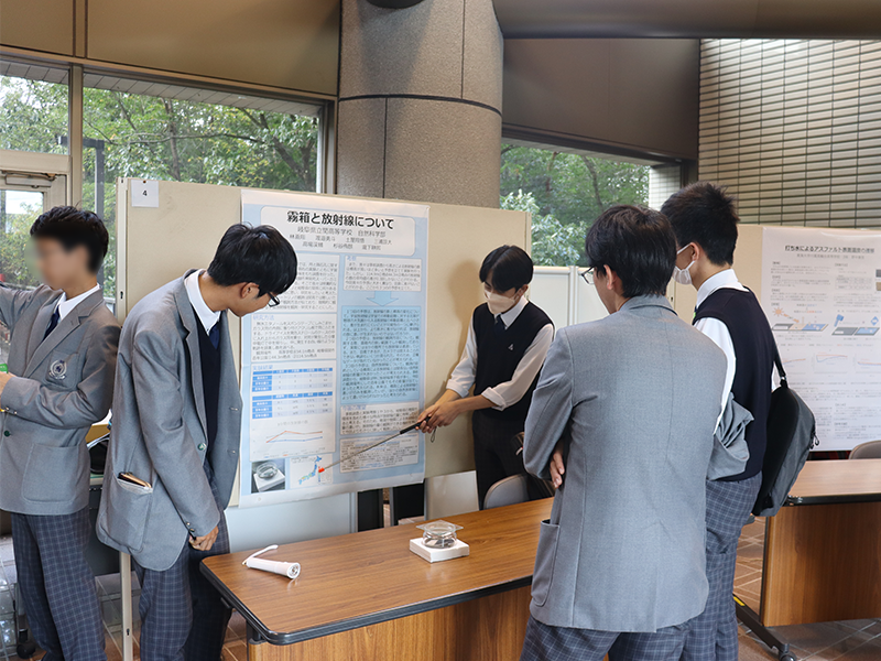高校生の皆さんが、科学にちなんだそれぞれのテーマについて調査・研究した成果をポスター展示するコーナーです。未来の研究者たちに質問してみよう!